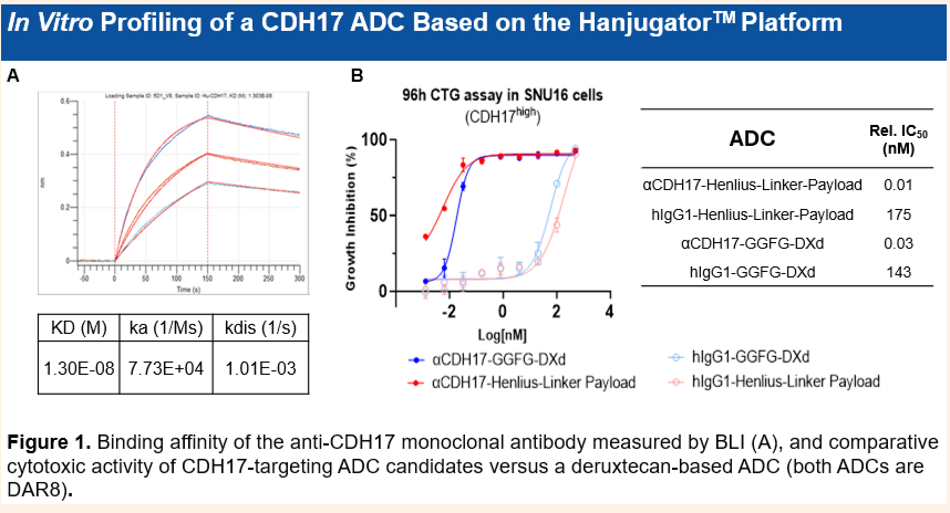 • 高親和力與特異性: 該ADC使用的抗體對CDH17具有納摩爾級(nanomolar)的結合親和力;不會與鈣粘蛋白家族的其他成員發生脫靶結合,且在MPA檢測中表現乾淨。
