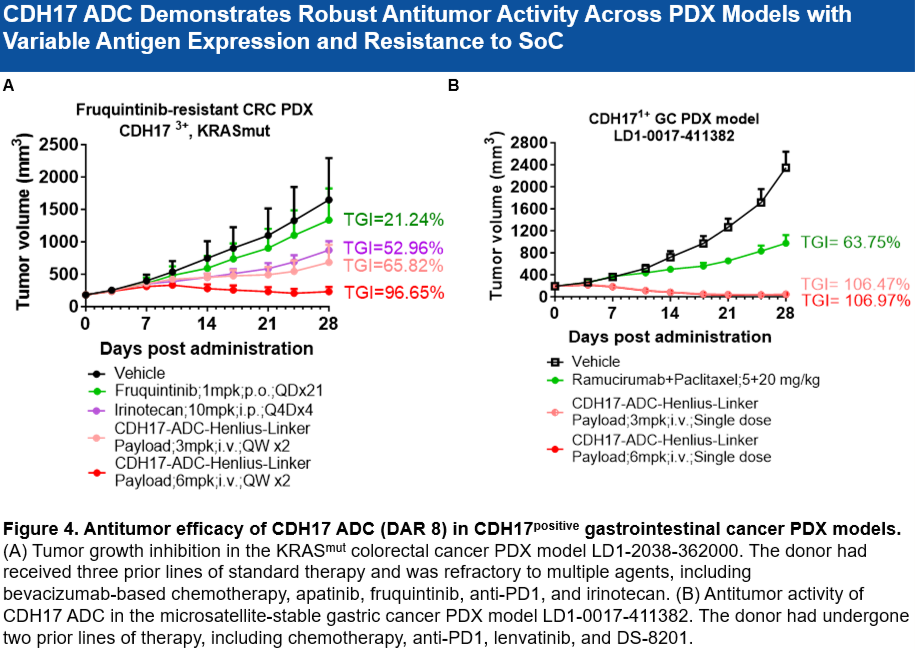 • 對低表達腫瘤有效: 在CDH17低表達、PD-L1低表達的胃癌(GC)PDX模型中,單次給藥(3 mpk或 6 mpk)即可達到超100%的腫瘤生長抑制率(TGI)。