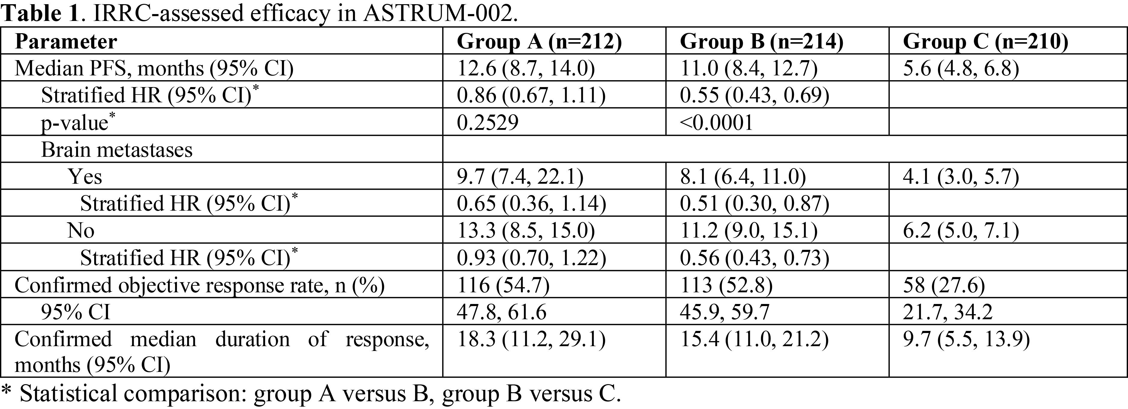 結果:從2019年11月25日至2023年6月15日(數據截止日期),636名患者被隨機分配到A組(n=212)、B組(n=214)或C組(n=210)。 中位隨訪時間分別為23.4個月(95%置信區間,21.6-24.9)、23.1個月(95%置信區間,21.4-25.6)和23.0個月(95%置信區間,20.7-25.6)。B組中位PFS顯著長於C組(11.0個月 vs. 5.6個月;分層HR=0.55,95%置信區間0.43-0.69,P < 0.0001),達到了研究方案中規定的優效標準。A組相比B組在PFS方面觀察到數值上的改善(12.6個月 vs. 11.0個月,HR=0.86,95%置信區間0.67-1.11,P=0.2529)。總生存期尚未成熟。其他療效結果見表1。導致死亡的治療相關不良事件在三組中分別發生10例(4.7%)、5例(2.3%)和7例(3.3%)患者中。