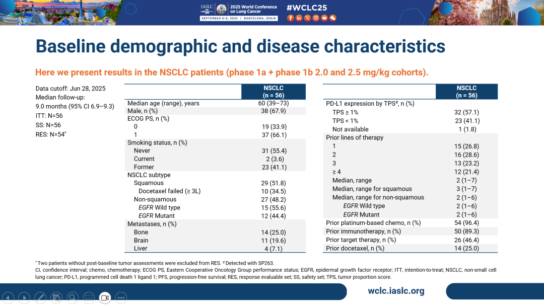 截至数据截止日期2025年6月28日,共计56例NSCLC患者入组Ia期及Ib期2.0和2.5 mg/kg剂量组,其中29例(51.8%)为鳞状,27例(48.2%)为非鳞状。鳞状NSCLC中,10例(34.5%)患者经多西他赛治疗失败。非鳞状NSCLC中,EGFR野生型/突变患者分别为15例(55.6%)及12例(44.4%)。
