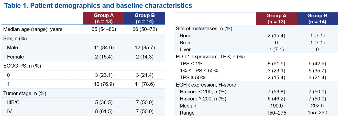 截至2025年3月5日,共有27例患者参与并随机分配至研究第3部分的A组(n=13)或B组(n=14)。两组患者分别每三周一次接受800 mg HLX07(A组)或1000 mg HLX07(B组)联合300 mg斯鲁利单抗和化疗。15例(55.6%)患者患有转移性sqNSCLC。中位随访时间为18.6个月。